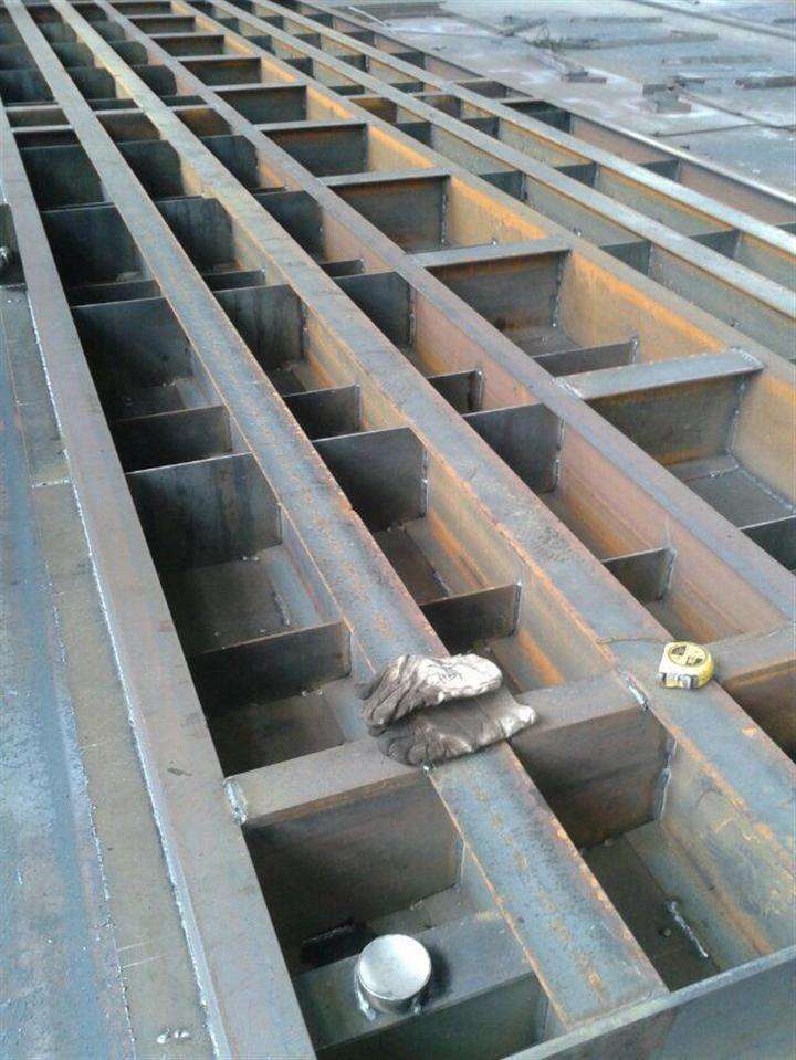 先說槽鋼秤體,它是以槽鋼為主梁,再以橫隔板一道道的相連,底部再用封板.